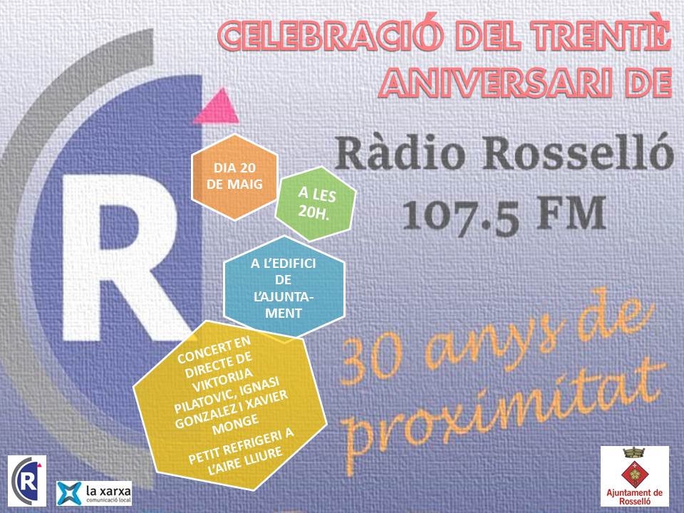 En motiu del 30è aniversari de Ràdio Rosselló, el 20 de maig a les 20.00h a l'edifici de l'ajuntament, s'oferirà un concert en directe